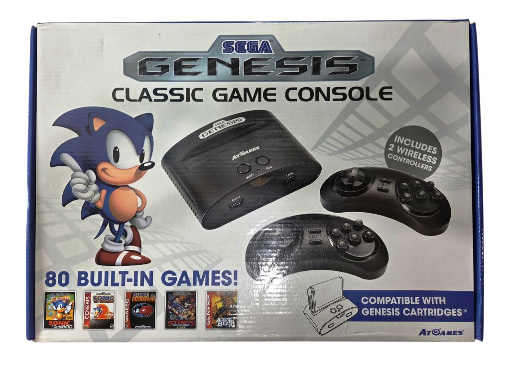 Genesis Mega Drive, console produzido pela ATGames, incluso 2 controles de 6 botões sem fio e 80 jogos na memória, dentre os quais grandes clássicos como Sonic, Sonic 2, Golden Axe 2 e 3, Altered Beast, entre outros (ver imagem 3), e possui encaixe para cartuchos.